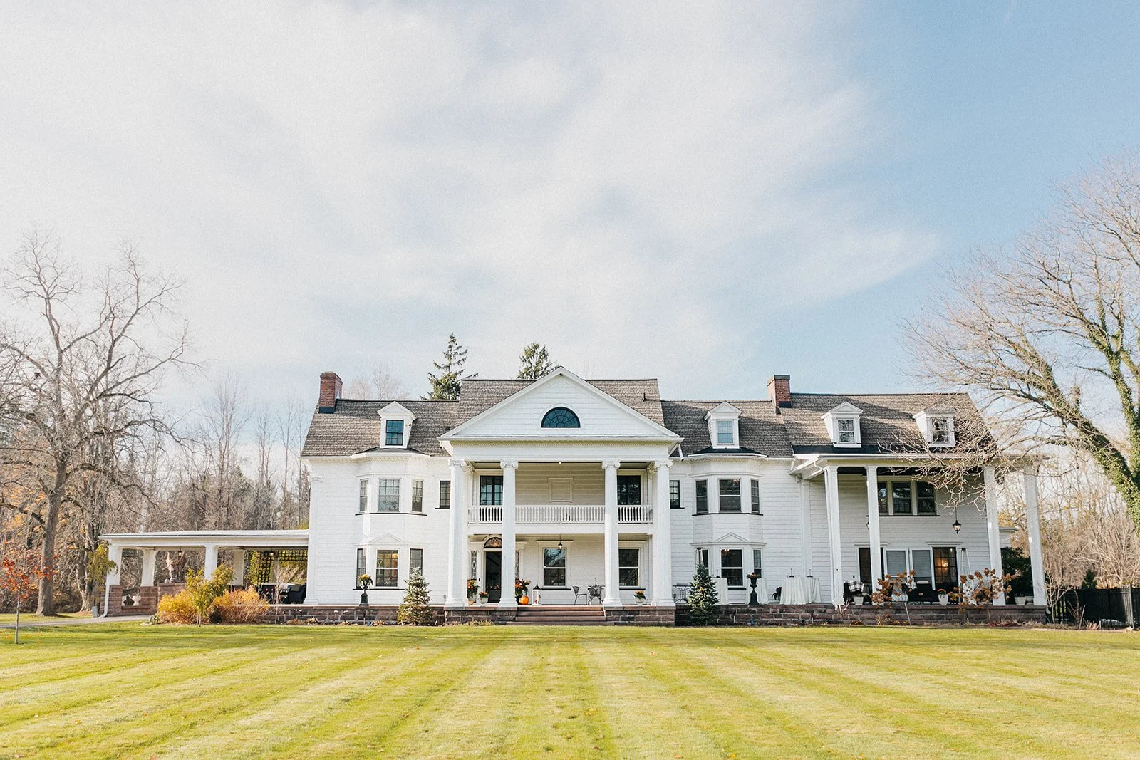 Whitehall Mansion was designed in 1905 by the famed architect, J Foster Warner, who also designed the popular Eastman House in Rochester, New York. Whitehall is nestled on 11 sprawling acres of English-style gardens and majestic trees and displays striking architectural detail. Whitehall is the perfect setting for any type of event, from casual to elegant, conveniently located between Rochester and Buffalo New York. The mansion's interior boasts antique crystal chandeliers, Italian imported marble fireplaces, herringbone wood floors, and a spectacular staircase for the perfect photo op. There are five exquisitely appointed guest rooms and suites for accommodating up to 10 overnight guests. Our bridal suite is complete with a king-size bed, a lovely sitting room to host the wedding party and guests, and a large ensuite with hair and makeup chairs, making it the perfect space for any bridal party to prepare for your special event. When considering outdoor events, you will enjoy expansive and welcoming patios overlooking the large lawn and gardens with water features. The patios are equipped with comfortable furniture as well as warming towers.